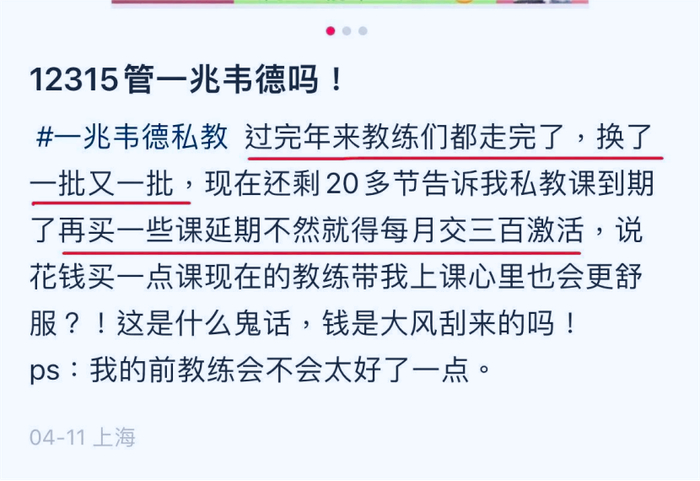 有的私教用威胁的口吻,反正就是让你掏钱:“现在还剩 20多节告诉我,私教课到期了,再买一些课延期,不然就得每月交三百激活,说花钱买一点课,现在的教练带我上课心里也会更舒服。”