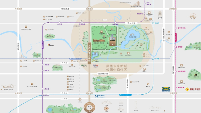 水之心、悦动之心、蓉漂人才公园、汇智颐年四大主题生态公园,共同组成城市绿洲,将城投置地天湖岸环绕其中,优美的自然环境与良好的城市界面为高阶滨水资源大宅提供良好基础。