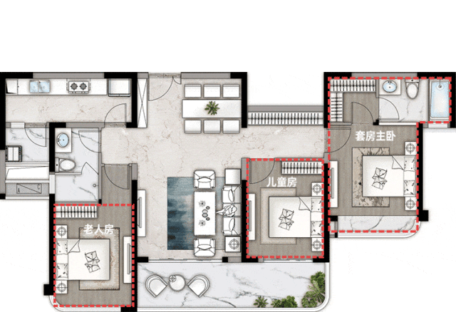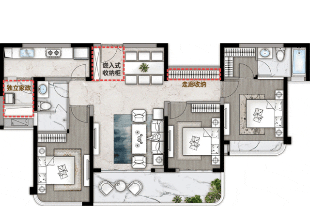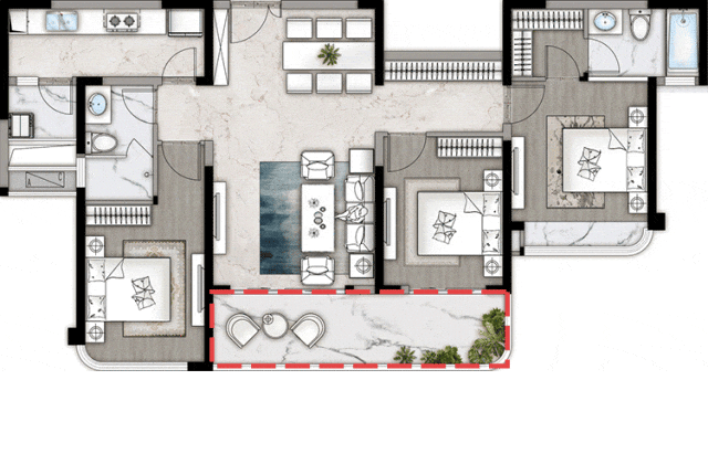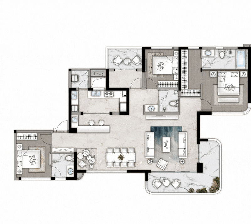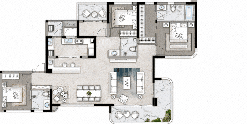 独立门厅入户,更具私密性与舒适度,约270度转角全景阳台,奢阔视野,景无止尽,餐客厅约10.2米超大面宽,组成大横厅的通透与奢侈,客厅也可单独形成围合式的方厅,营造别墅式客厅居住感受,双主卧设计,让生活空间更多样化,满满仪式感。
