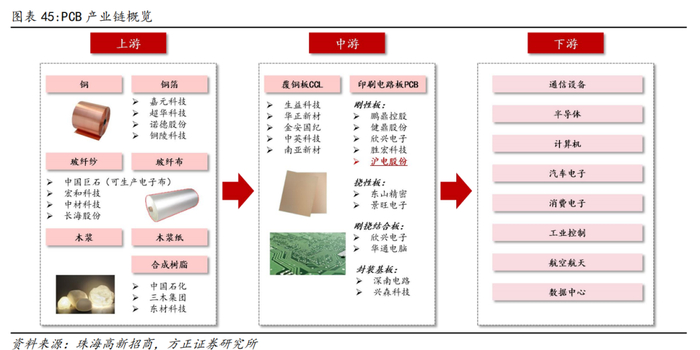 PCB上游主要为大宗商品,下游囊括千行百业。PCB产业链中,上游为铜箔、玻纤布、木浆纸、合成树脂等,中游为覆铜板及PCB,其中,覆铜板是PCB的上游,是PCB原材料的重要组成部分,下游则是通信设备、半导体、计算机、汽车电子、消费电子、工业控制、航空航天、数据中心等,应用范围广阔。