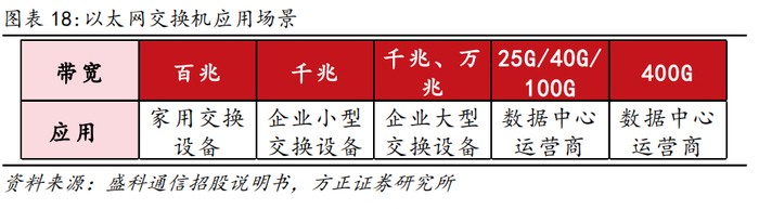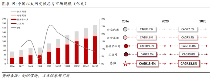 数据中心用交换机引领增长。以太网交换机分为百兆、千兆、万兆、25G、40G、100G、400G、800G等,分别可用于家庭、企业、数据中心和运营商。从以太网交换芯片(以太网设备的核心)来看,数据中心将引领交换机未来增长,2020-2025年CAGR为18.0%,其次为工业网,2020-2025年CAGR为9.8%,第三为企业网,2020-2025年CAGR为7.6%。