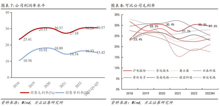 公司毛利率在可比公司中位列第一,盈利能力优秀公司毛利率从2018年的23.4%提升6.1个百分点至2019年的29.5%,主要系产品结构优化与经营效率提升。近几年公司毛利率维持在27%~31%区间内。2023H1尽管下游需求疲软,行业竞争加剧,公司仍实现毛利率29.6%,在可比公司中位列第一。2023前三季度,公司毛利率继续提升至30.57%。我们认为,随着产品结构持续优化,公司毛利率有望持续上升。
