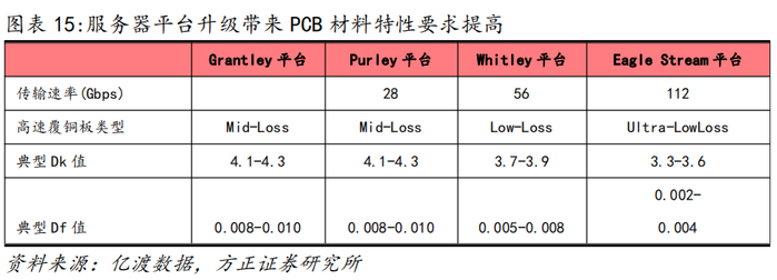 服务器平台升级传输速率成倍提升对应材料特性要求提高。覆铜板材料损耗特性从Whitley平台的Low-Loss升级至EagleStream平台的Ultra-LowLoss。表征覆铜板高频高速及稳定传输的参数指标Dk值从Whitley平台的3.7-3.9升级至EagleStream平台的3.3-3.6,Df值从Whitley平台的0.005-0.008升级至EagleStream平台的0.002-0.004。对应PCB板材从M4升级至M6甚至于下一代的M7-M8。AI服务器由于高算力需求对传输速率要求更高,其PCB材料或对应M7-M8等级。