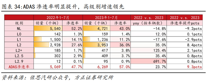 ADAS搭载率提升+智能驾驶级别提升趋势较为明确。根据佐思汽研,2023年1-7月具有ADAS功能的车占比达57.0%,相较于2022年1-7月提升9.3pcts,ADAS搭载率提升趋势较为明确。此外,我们看到,L2级别的搭载率提升至36.0%,在具备ADAS功能的车中占比达到63.1%,占比最高;L2以上级别的搭载率从4.7%提升至8.4%,车辆数从50万辆提升至92万辆,同比+84.6%,增速领先。