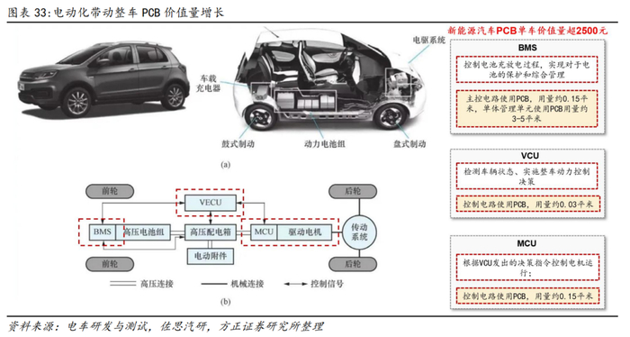 新能源车三电系统带动PCB需求。从电动化的角度来看,新能源车相对于传统的燃油车的差别主要在于三电系统,即电池管理系统BMS、整车控制器VCU、以及电机控制器MCU。其中BMS需要的PCB包含主控电路PCB和单体管理单元PCB,主控电路PCB用量约为0.15平方米,管理单元PCB用量约为3-5平米;VCU和MCU所需PCB用量相对少,分别约为0.03平米、0.15平米。根据佐思汽研,以特斯拉Model3为例,整车PCB价值量超过2500元,是传统燃油车的6倍多。
