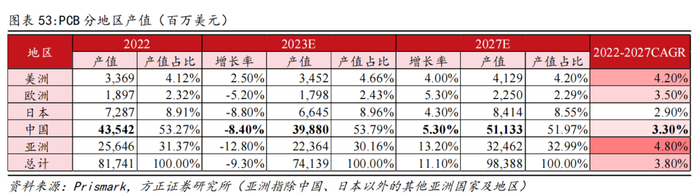 中国保持PCB制造中心地位,但生产地转移趋势已经显现。21世纪以来,PCB产业链向中国等发展中国家转移,从产值来看,目前中国产值占比达53.27%,近年来占比均较为稳定,2027年预计占比为51.97%,仍保持行业的主导制造中心地位,但随着产品结构与生产转移,中国PCB产值2022-2027年CAGR低于世界平均值,而除去中国及日本之外的亚洲其他地区增速为4.8%,为各地区中最快,PCB产业向除中国外的亚洲地区转移趋势已现。