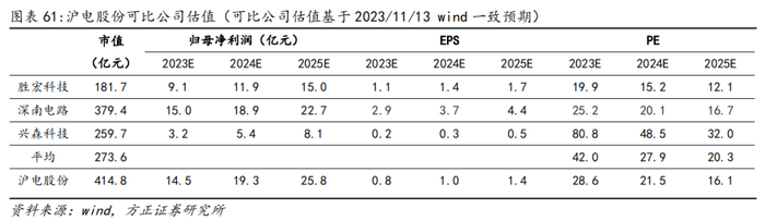 选取同为PCB产品研发制造业务的兴森科技、深南电路、胜宏科技作为可比公司,采用PE估值法,沪电股份2023/2024/2025年对应PE分别为28.6/21.5/16.1x,相对于可比公司均值42.0/27.9/20.3x具备估值优势,给予“强烈推荐”评级。