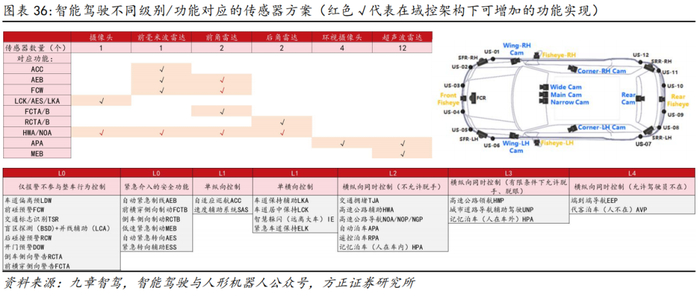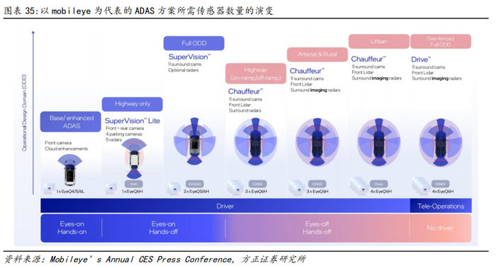 智能驾驶级别提高须伴随传感器数量增加。目前主流智能驾驶方案路径有两种,一种是多种传感器融合的方案,一种是以特斯拉、mobileye为代表的视觉为主的方案,无论是多传感器方案还是视觉方案,随着智能驾驶级别的提高,所需要的传感器数量都在增加。mobileye方案中从最基础的Eyes-on/Hands-on(对应L2以下级别)到Eyes-on/Handsoff(对应L2+左右级别),摄像头数量从1个提升至11个(可选装一个雷达);以多传感器方案为例,我们可以看到不同的传感器对应不同的功能实现,L2的智能驾驶方案一般为5V5R~12V5R,L1级别的智能驾驶传感器方案仅需1V1R,智能驾驶级别的提高(即ADAS功能增加)必须伴随着传感器数量的增加。