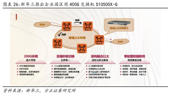 头部交换机厂商顺应企业园区数智化趋势已推出400G企业园区用交换机,未来400G有望从数据中心向企业园区持续渗透。新华三集团凭借对网络发展趋势的深刻洞察,认为400G大带宽时代已经到来。基于数据中心级网络技术和创新设计理念,新华三在2022年率先推出了具有超宽、绿色、智能、可信四大核心价值的400G园区核心交换机S10500X-G系列,突破园区交换机性能瓶颈,实现400G超宽互联,引领园区网络进入超宽时代。