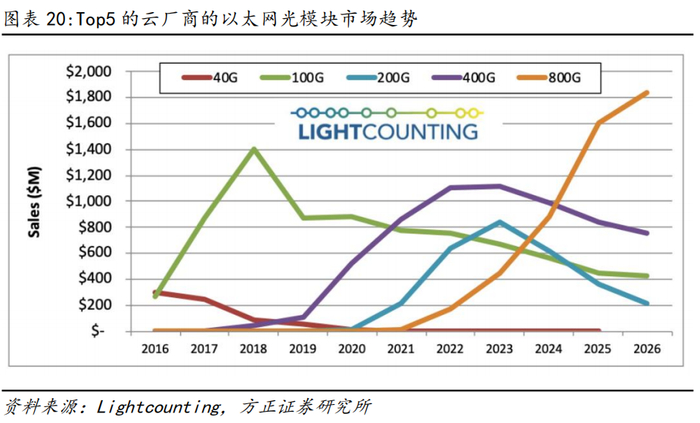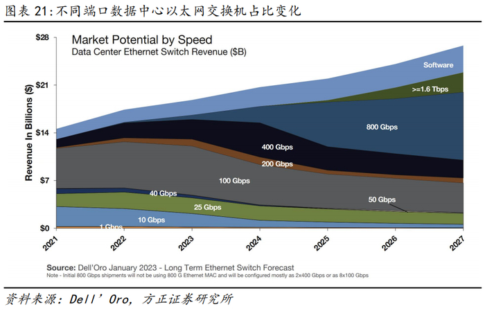 AI推动数据中心用交换机向800G升级。数据中心连接交换网络中,光模块负责光电信号转换,交换机负责对接收信息进行转发,光模块作为交换机的核心配件,其传输速率与交换机端口直接相关。我们根据800G光模块的出货量来判断800G交换机渗透的趋势,根据Lightcounting,以太网光模块市场后续的主要驱动力为800G光模块,据此预计800G交换机也将迎来出货量的显著增长。根据Dell’Oro,数据中心应用中,2027年400G及以上交换机占比将超70%,800G将成为主流,AI算力需求爆发也将推动数据中心用交换机向800G加速升级。
