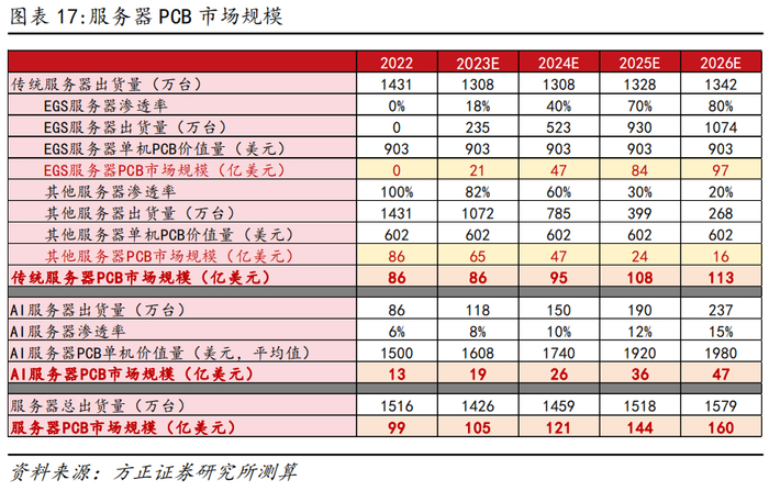 市场空间:2026年服务器PCB市场规模有望达到160亿美元。受益于AI服务器占比提升与服务器平台升级,我们预计服务器PCB将迎来量价齐升。根据测算,预计2026年全球服务器PCB市场规模为160亿美元,2022-2026年CAGR达12.8%,其中2026年AI服务器PCB市场规模为47亿美元,2022-2026年CAGR达38.3%。