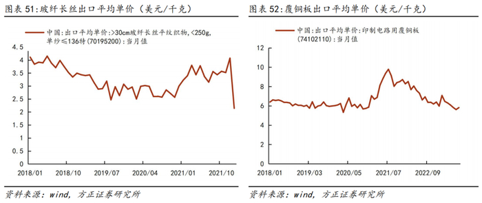原材料价格处于低位,PCB厂商成本端压力相对较小。从铜价、树脂与玻纤价格来看,铜价仍处于高位,但相比2020年有所缓和,树脂和玻纤价格呈下降趋势,目前处于低位,覆铜板成本端压力主要来自铜价。从出口单价观测,覆铜板当前价格仍处于低位,目前PCB厂商的成本端压力仍相对缓和。