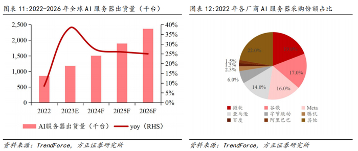 服务器出货量短期略降,长期增长趋势不变。受下游需求疲软以及终端库存持续调整影响,TrendForce预计2023年全球服务器出货量同比下降5.94%,但随着2024年下游库存回归正常水位,新服务器平台加速渗透,AI服务器快速增长,服务器整体出货量将在2024年恢复增长。