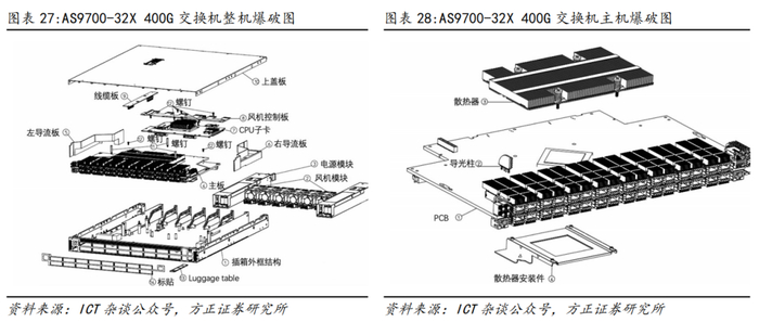 交换机端口扩容带动高层数PCB用量增长。我们看到400G交换机使用的PCB层数高于100G交换机,以EdgecoreNetworks的100G交换机和400G交换机为例,AS7726-32X(100G+2x10G)的PCB分别为交换板14层PCB,CPU板12层PCB,风扇板4层PCB;AS9700-32X(400G)的PCB分别为交换板24层PCB,CPU板12层PCB,风扇板4层PCB以及其他产品。我们认为,在数据中心用交换机从200G+400G向400G+800G升级与400G交换机向企业园区下沉的趋势下,交换机端口扩容趋势明显,将强劲带动高层数、高速PCB板用量增长。