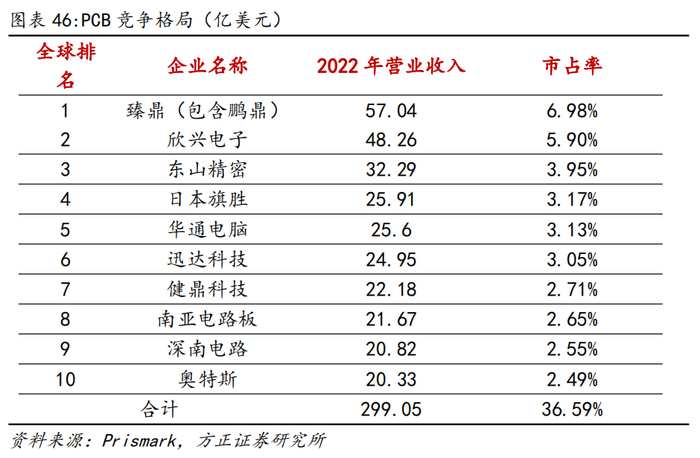 PCB竞争格局较为分散,CR10仅37%。2022年全球排名前十的PCB厂商中,臻鼎营收规模约57亿美元,欣兴、东山精密、旗胜紧随其后,东山精密全球排名第三,在中国内资PCB厂商中排名第一,内资PCB厂商在全球PCB行业中扮演着越来越重要的角色。