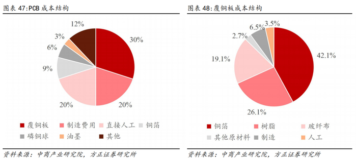 覆铜板占据PCB成本的30%,覆铜板成本主要构成为铜箔、树脂与玻纤布。根据中商产业研究院,PCB成本主要由覆铜板等直接原材料构成,占比近50%,其中覆铜板占据30%,由于人工成本与制造成本变化较小,因此决定PCB成本的主要是原材料的价格,尤其是覆铜板;覆铜板的成本主要由铜箔、树脂和玻纤布构成,占比分别为42.1%、26.1%、19.1%,合计占比87.3%,因此原材料的价格波动通常会通过覆铜板传递给PCB厂商。