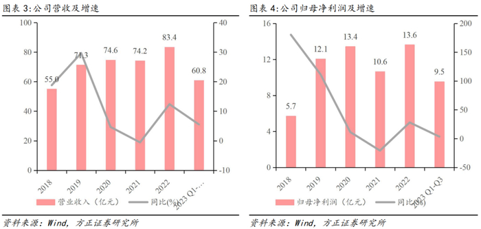 营收稳健增长,经营韧性十足。公司整体营收稳健增长,2019-2021年公司数通业务从无线侧向数据中心有线侧切换,营收仍能维持相当体量,展现公司强大研发生产能力以及十足经营韧性。2022年受益于企业通讯端的结构性需求,以及汽车产品全年需求旺盛,公司全年实现营收83.36亿元,同比增长12.4%。2023年前三季度公司实现营收60.8亿元,同比增长5.53%,其中Q3单季度公司实现营收23.2亿元,同比增长14.4%,环比增长22.3%。中长期来看,下游数通及汽车两大行业长期增长趋势确定,公司增长动能充足。