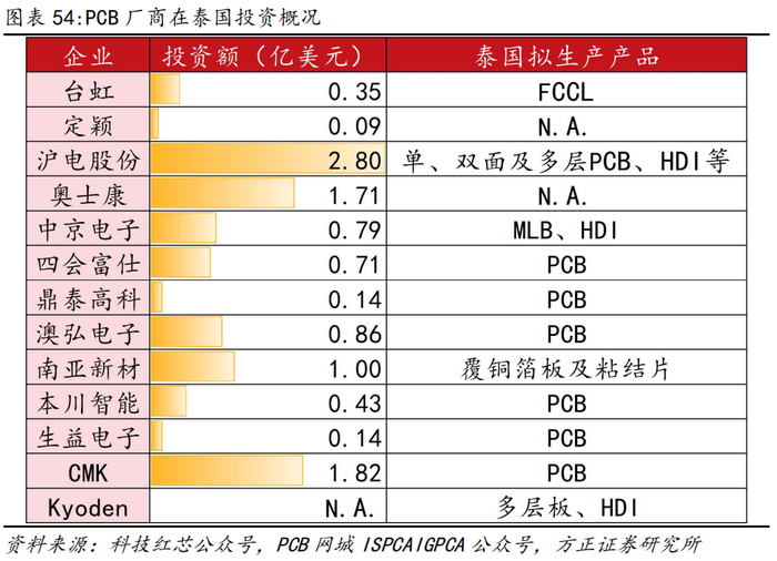泰国以其生产单面板/双层板及多层板等传统PCB产品的优势,吸引了众多厂商投资设厂。目前已有多家PCB企业计划或已经在泰国建厂,其中既有CMK、Fujikura、Mektec、三菱瓦斯等日系企业,也有欣兴、定颖、台虹、台耀、联茂、华通、汇和、泰鼎、敬鹏、竞国等台系企业,还有沪电股份、奥士康、中京电子、四会富仕、中富电路、明阳电路等内资企业。其中,沪电股份已购买位于泰国洛加纳大城工业园区内的面积约201,846.8平方米的土地,泰国工厂预计2024年Q4量产,将成为公司后续海外新订单的重要厂区。