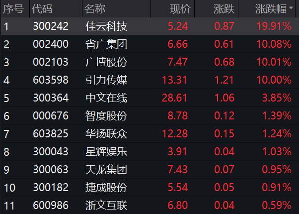 11月17日早盘,抖音平台概念再次掀起涨停潮,概念指数涨3.43%领涨两市,其中佳云科技20cm涨停,省广集团、广博股份、引力传媒均实现涨停。
