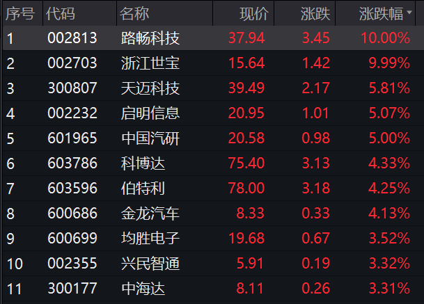 受此消息影响,自动驾驶概念早盘尾盘快速拉升,概念指数上涨1.1%,路畅科技、浙江世宝涨停,天迈科技、启明信息、中国汽研上涨5%以上。