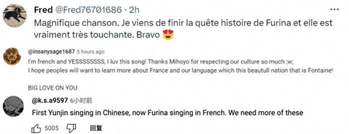 “First Yunjin singing in Chinese, now Furina singing in French . We need more of these.”