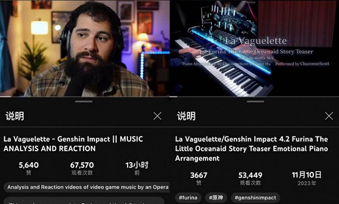 前面我们已经说过,YouTube上有许多海外博主在做二创,而国内二创也不少,比如AI版大伟哥(玩家对米哈游创始人刘伟的称谓)演唱的《轻涟》等。另外抖音上的原神二创音乐会活动,不仅吸引了高人气独立音乐团体”chilichill“和”房东的猫“参与,更对包括《轻涟》在内的《原神》音乐作品起到了助推和放大效应。