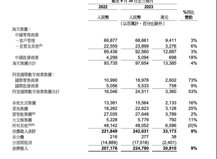 在财报中,盒马的业绩被归类为“其他分部收入”。截至2023年9月30日止三个月,所有其他分部收入为480.52亿元,同比维持平稳,主要是由盒马、飞猪、阿里健康和智能信息的收入增长所贡献,部分被与去年同期相比消费者减少囤积行为造成客单价减少而导致的高鑫零售收入下降所抵消。