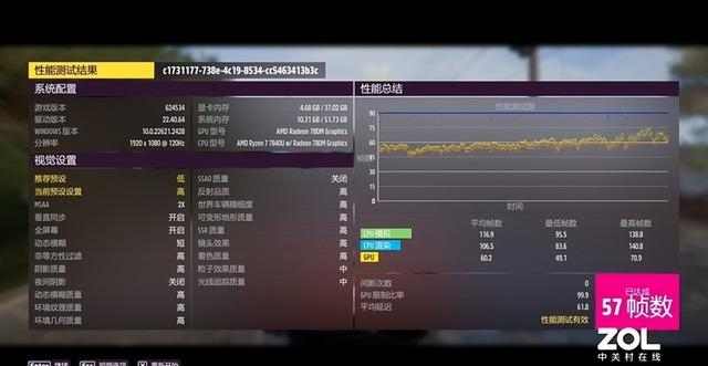 《极限竞速:地平线5》在高画质下,平均帧数在57帧,如果换成低画质,平均帧数会上升到76,大家可以根据自己的需求进行调整,像笔者觉得60帧就足够了,那么会选择高画质来玩,更追求帧数和流畅度则适合低画质体验。