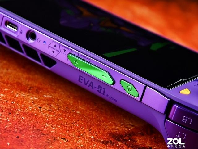 OneXPlayer 飞行家EVA联名限量版掌机外观采用经典初号机紫色作为主配色,按键辅以黄绿两种初号机原版涂装元素,机身表面采用大面积类肤涂层打磨,触感优秀。这款装机尺寸为263x99x22mm,作为掌机大小适中,机身轻盈,重量仅有599克,这个重量比其他品牌的掌机轻不少,减少长时间使用带来的重量负担,也适合移动携带。