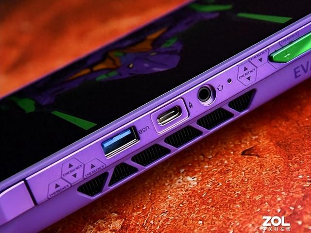 OneXPlayer 飞行家EVA联名限量版掌机顶部准备了一个USB-C 4.0接口,这是目前最强的USB接口,传输速率跟雷电4一样,通过这个接口外置显卡拓展坞或者外接屏幕都没有问题。此外顶部还搭载一个USB-A 3.2接口,一个3.5mm音频接口,旁边是绿色的音量调节按键和开关HOME键。
