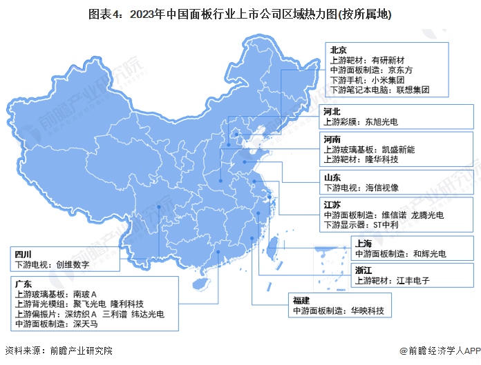 从上市企业区域分布情况来看,面板产业链上中下游企业主要分布在华东和华南地区。其中中游面板制造企业主要分布在北京、广东、江苏等地。