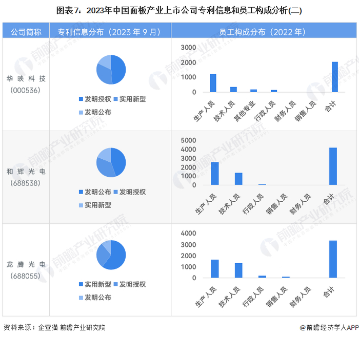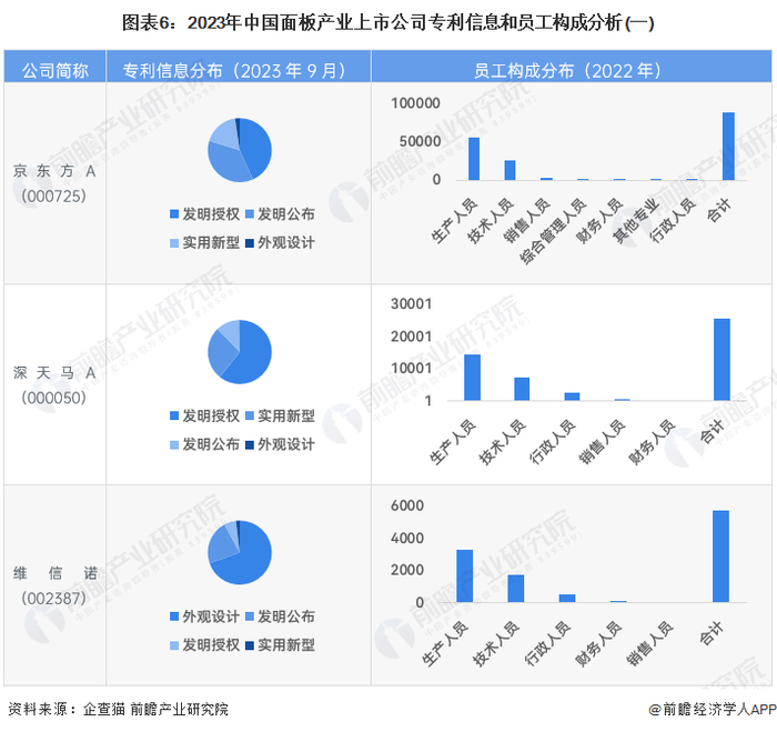从面板行业的上市企业已有的公开信息分析,专利信息相对较多的企业是京东方,专利数量超过50000条;京东方、深天马的员工数量较多,总数均超过万人。
