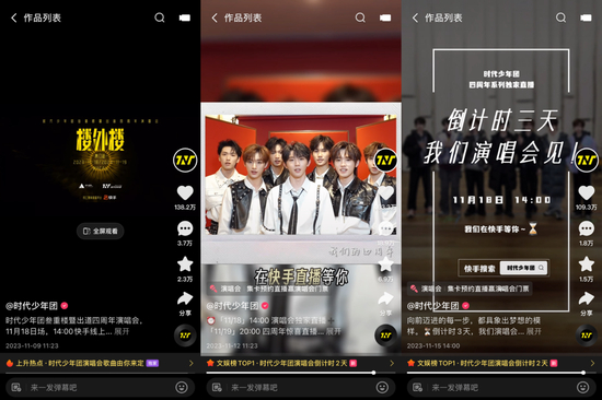 除了暖心祝福,近日时代少年团更是在快手频频营业,先后发布多条视频向粉丝发起演唱会直播和四周年惊喜直播的邀约。不仅有帅气黑西装的官宣视频,还有全员第一视角的自拍视频,更有练习室独家彩排视频。不仅如此,快手还在站内发起了投票选歌活动,粉丝票选的TOP 3歌曲将成功加入此次演唱会歌单。截至目前,《相遇》《大时代》《楼外楼》为粉丝投票选出的演唱会最想听的歌曲。