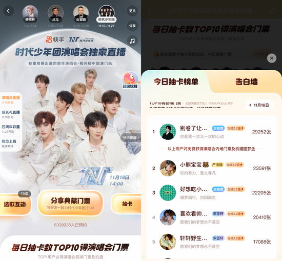 截至目前,此次集卡活动的幸运用户已全部产生。抽卡次数最多的用户免费获得了演唱会内场门票及机酒圆梦金,抽卡榜单前十名免费获得演唱会随机门票。在集卡的过程中,用户随机翻牌还有来自时代少年团成员的语音等惊喜彩蛋。