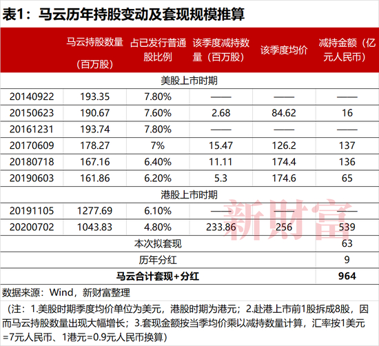 新财富统计发现,马云历年套现金额,已合计达到964亿元,近千亿规模(表1)。此次拟套现的63亿元,当是其套现历程中微不足道的一次。