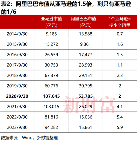 在阿里巴巴美股上市的当月,其市值达到1.4万亿元,而当时亚马逊市值则只有9000亿元,仅为阿里的2/3。而今天,1个亚马逊市值高达10万亿元,已相当于6个阿里巴巴(表2)。