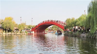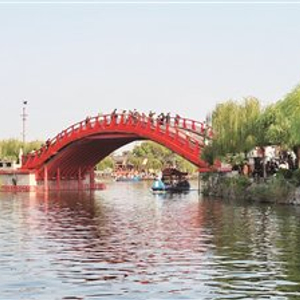 我直奔虹桥。它横跨“汴河”之上,木制单孔拱形,漆以朱红色,气势恢宏。站在虹桥顶部,视野顿时开阔起来。“汴河”水面宽阔,碧波荡漾,游船往来穿梭。两岸绿树花卉吐翠争艳,楼台亭榭鳞次栉比,一片水乡的秀美景色尽现眼前。虹桥是南苑的中心景区,以此为起点向四面八方延伸,周边有迎宾主题区、游艺活动区、住宿休息区、民风民俗区,让游客只恨自己腿短脚慢眼少,只怨自己分身乏术,只得忍痛割爱诸多景点。