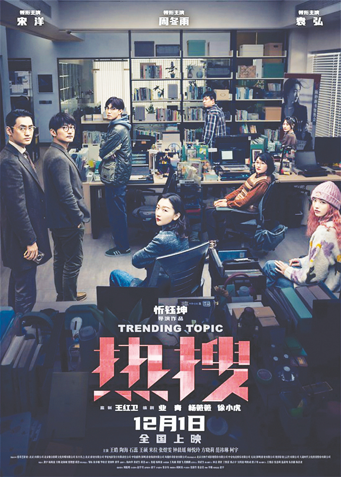 由忻钰坤执导,周冬雨、宋洋、袁弘领衔主演的电影《热搜》定档12月1日,也是强类型片。影片中,少女从“书桌”被送上“酒桌”,揭开了富商“选妃”利益链的一幕,电影以人人都熟悉的网络为载体,挖掘潜藏在现代都市下的善恶对抗,视角新鲜却不失犀利毒辣。