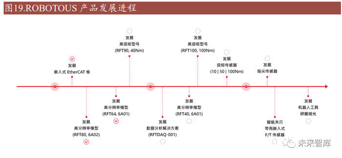 公司的 6 轴力扭矩传感器(RFT 系列)提供了最精确的力和扭矩测量。由于是电 容型传感器的特性,RFT 系列是最耐用和最具性价比的传感器,同时承诺良好的 数据读取能力。与电阻、光学等其他类型的力扭矩传感器相比,非接触式传感结 构具有超乎想象的抗磨损能力,并且与其他类型的传感器不同,不需要任何繁琐 的外部信号放大设备。 世界各地的许多客户一直在自动化和研究应用中广泛使用 ROBOTOUS 的传感器, 例如:医疗、工程、军事、制药等。ROBOTOUS 六轴力矩传感器的设计可与目 前市场上的大多数机器人手臂或其他类型的协作机器人配合使用,无需事先进行 任何修改。公司的传感器不仅适用于制造业,也适用于医疗或康复设备,甚至适 用于无人机行业。