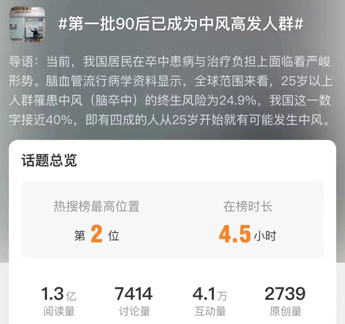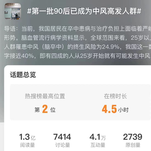 中风或脑卒中,是一种突发的神经系统疾病。如今这种长期被视作中老年人的健康隐患,也悄然向年轻人蔓延。随着90后等年轻群体在社交媒体上越来越频繁地讨论中风话题,我们有必要对这一现象进行深入探讨。