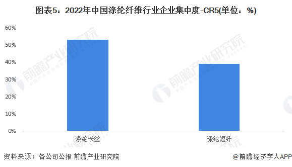 目前,国内涤纶纤维行业整体的市场集中度较高,2022年中国涤纶纤维行业中,涤纶长丝企业集中度CR5为53%,涤纶短纤企业集中度CR5为39%。