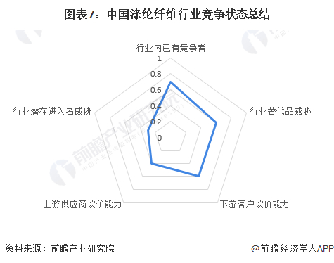 从五力竞争模型角度分析,目前,我国涤纶纤维行业企业数量较多,行业竞争较为激烈;在上游议价方面,由于大部分涤纶纤维中游企业已在上游PTA、MEG等产品布局产能,因此上游低价能力较低;涤纶纤维下游企业数量较多,应用领域广泛,下游议价能力较强;在潜在进入者方面,行业存在较高的进入壁垒,潜在进入者对目前市场的威胁较小;替代品方面,涤纶纤维行业存在一定的替代品威胁。