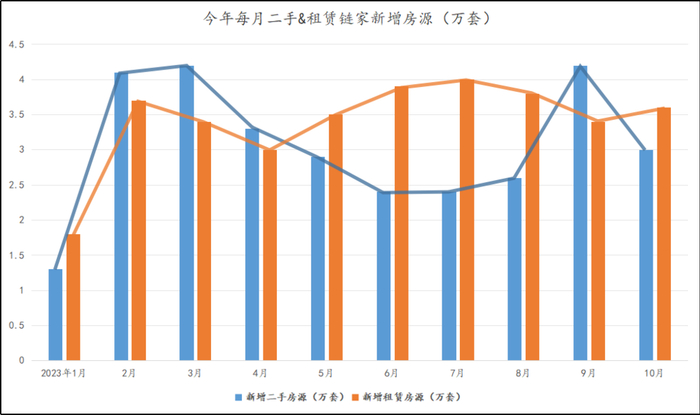 我将租赁每月新增房源数据,和二手房源每月新增房源数据放在一起,典型的此消彼长: