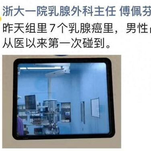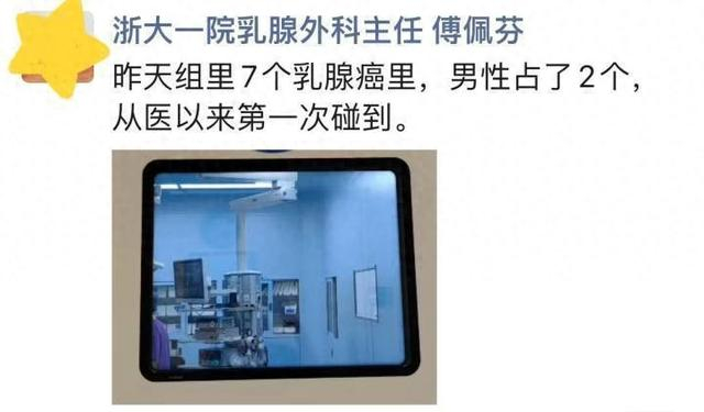 11月16日上午,浙江大学医学院附属第一医院乳腺外科主任傅佩芬主任医师发了这样一条朋友圈:昨天组里7个乳腺癌里,男性占了2个,从医以来第一次碰到。