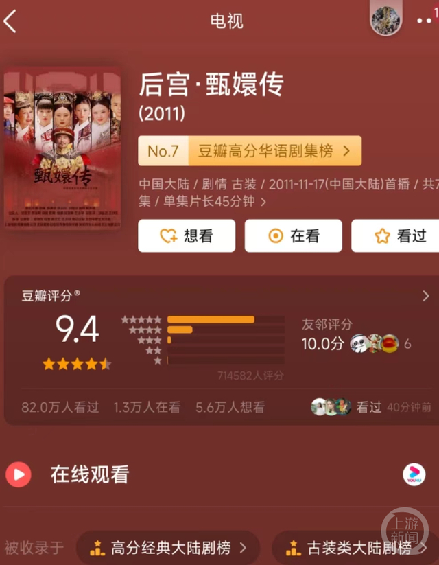 如果说,剧中纯元皇后是“渣渣龙”的白月光,那这部剧毫无疑问就是剧迷心中的白月光。直至今日,该剧在豆瓣评分中的分数高达9.4分,共有82万人看过,是豆瓣高分华语剧集榜第7。这一榜单可谓神仙打架,第一名是《武林外传》,《西游记》《红楼梦》等童年经典分列第三四位。值得一提的是,在2016年的一篇报道中,《甄嬛传》评分还是8.9。而在该剧播出10周年时,评分9.3。也就是说,在播出后的12年里,《甄嬛传》的评分在走高。