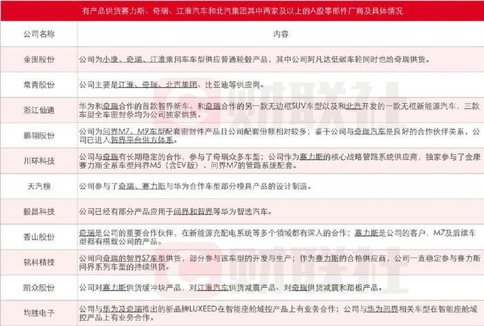据财联社不完全整理,供货赛力斯、奇瑞、江淮汽车、北汽集团其中两家企业及以上的A股零部件厂商包括金固股份、凯众股份、常青股份、浙江仙通、鹏翎股份、川环科技、天汽模、毅昌科技、香山股份、铭科精技和均胜电子,具体情况如下表: