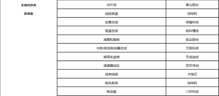 在华为-奇瑞智界S7系列核心零部件供应商中,涉及上市公司包括瑞鹄模具、常青股份、浙江仙通、金固股份、鹏翎股份、新泉股份、毅昌股份、常熟汽饰、天龙股份、香山股份、保隆科技、铭科精技、凯众股份、万安科技、天成自控、双环传动、卡倍亿、伯特利、川环科技、银轮股份、华依科技、拓普集团、浙江世宝、华阳集团、均胜电子等,具体情况如下表: