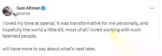 “我喜欢在OpenAI的时光,”Altman被解职后在X上回应道,“这对我个人来说是变革性的,希望对世界也有一点变革。最重要的是,我喜欢与这些才华横溢的人一起工作。”