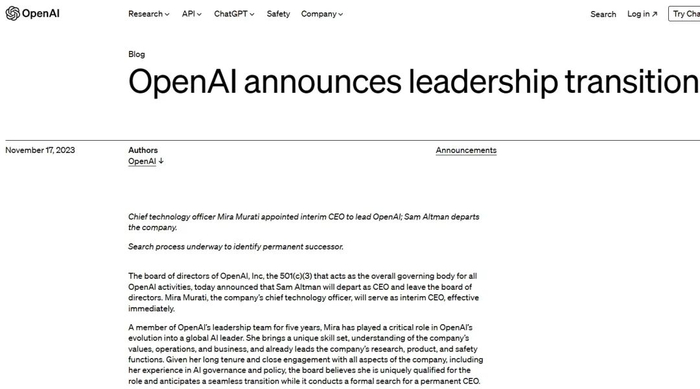 该公司董事会在声明中表示,Sam Altman的离职是在董事会经过深思熟虑的审查程序之后得出的结论,他在与董事会的沟通中“不坦诚”,阻碍了董事会履行职责的能力,董事会不再相信他有继续领导OpenAI的能力。