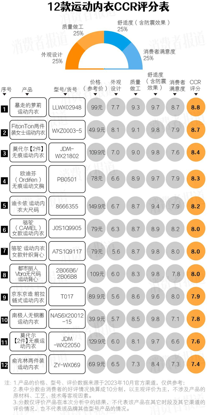 2023年10月,《消费者报道》在京东商城等官方旗舰店搜寻热卖的12款运动内衣,汇总了12万条关于运动内衣的消费评价情况并进行分析,看看哪款运动内衣备受姐妹们的青睐。